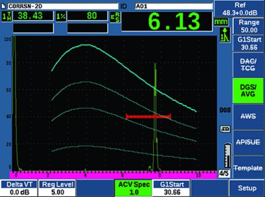 其它測量 | DGS/AVG的上沖值(dB)、DGS/AVG的ERS(等效反射體大小)、AWS D1.1/D1.5的A、B、C和D值定級、抑制值、回波到參考dB值。 |